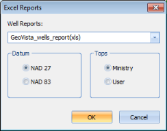 Use the Excel Reports dialog box to create an Excel spreadsheet with information about the wells you select. You can use one of the report templates that comes installed with GeoVista, or you can create your own template to suit your needs.