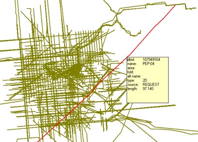 When you click on an object on a shape file layer, GeoVista highlights the object in a different color and displays the object's information in a box. The following example shows what happens when you select a seismic line on a shape file layer that displays eight fields.