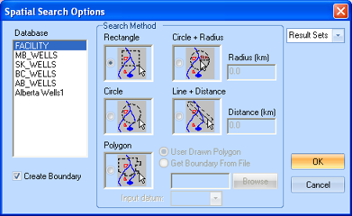 Select the database that you wish to search. You can select from a standard database, or you can select one of your result sets and refine your results by searching a particular area. If your selection doesn't match the area you are searching, you will receive a pop-up warning. For instance, if you viewing a map of Alberta and attempt a search of Manitoba wells (MB_WELLS database) you will receive the following error message: