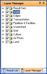 Use the Object Manager bar to control which information displays in your map. You can view this information on two tabs: Layer Manager and Result List.