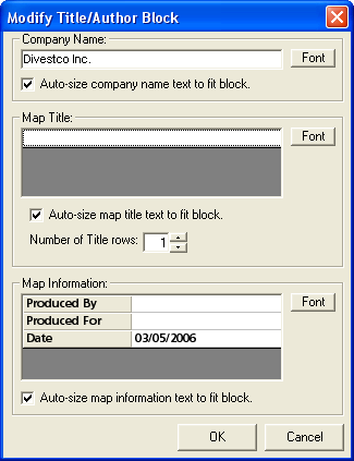 To open the Modify Title/Author Block dialog box, click <Edit Author's Block> on the Print Layout Tool's Drawing toolbar. You can add information to your printout that tells who printed the map, where the printout is headed, and the print date. The fields appear empty (except for the date), unless you supplied this information in the Print Setup dialog box.