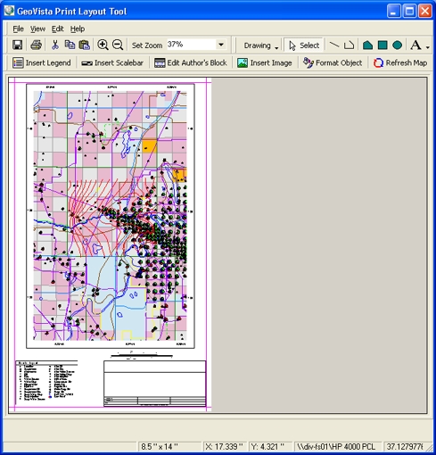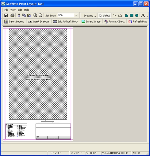 When you first open the GeoVista Print Layout Tool, the graphical view of your map is turned off. This is because if you have a very large or complicated map, it might take a few minutes for GeoVista to generate the view. With the view turned off, you can quickly open the GeoVista Print Layout Tool and work with the map without having to wait for the map to generate. The following is an example of how your preview will look.